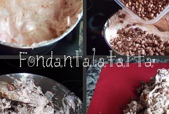 Se funden las nubes en una olla con el toque de mantequilla (foto 1). Añadimos los krispies (foto 2). Se mezcla todo bien (foto 3) y lo vertemos en una superficie para amasar (foto 4).