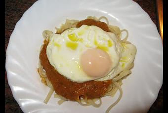 Ingredientes:- 200 gramos de pasta, en este caso tallarines, aunque la podéis hacer con lo que tengáis en casa.- Tomate frito casero.- 2 huevos.- Aceite de oliva virgen extra.- Un par de hojas de laurel. - Sal.
