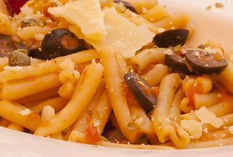 250 gr. de pasta al huevo1 latita de anchoas en aceite de oliva2 cucharaditas de alcaparras en vinagre3 tomates maduros ó un bote de tomate triturado1 bote pequeño de aceitunas negras si huesoorégano, aceite y saluna guindillaun ajoqueso parmesano rallado o en lascas