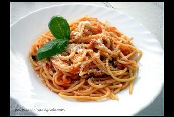 Ingredientes (4 personas): 2 latas de atún 1 cebolla pequeña 1 diente de ajo Aceite de oliva Un ramito (10 hojas aprox) de albahaca fresca 5 tomates grandes maduros o 1 lata pequeña de tomates triturados Pasta larga Queso parmesano rallado Sal y pimienta Primero ponemos a cocer la pasta en suficiente agua y un poco de sal, en 7 minutos debe estar lista. En un sartén grande y hondo sofreimos la cebolla y el ajo bien picados, a los dos minutos agregar el atún, revolver y cocinar por 3 minutos aproximadamente. Luego agregar las hojas de albahaca y por último la lata de tomates triturados, (o los tomates maduros cortados en cuadritos) sazonamos con sal y pimienta al gusto, tapamos y cocinamos a fuego lento por 10 minutos. Si vemos que esta muy seca, agregar 1/4 de vaso de agua y seguir la cocción hasta que esté espesita. Colar la pasta, agregarla al sarten de la salsa, si no cabe en el sartén no importa lo haces a la inversa y echas la salsa a la olla de la pasta. Revolver y servir con queso parmesano, decora con un par de hojitas de albahaca. Es una pasta que saca de apuros super rápida y deliciosa.