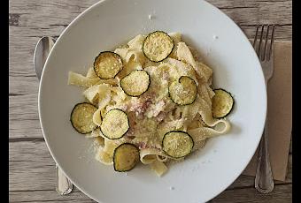 - Reparte la pasta en los platos, riega con la salsa y pon por encima rodajas finas del calabacín fritas.