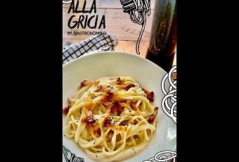 Esta es su receta tradicional, receta de manual, más que una receta, es un ritual que nos otorga un primer plato de pasta "blanca" que está entre el grandioso Cacio e pepe, pero sin guanciale, y una popular Carbonara, pero sin huevo. El resultado, una pasta cremosa, muy untuosa, llena de sabor, no solo por la intensidad del queso Pecorino de Amatrice o romano, sino también por lo decadente y las ráfagas de inmensa sapidez que nos da el guanciale.