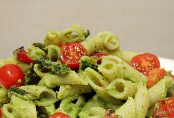 En un bol grande mezclamos la pasta con la crema de aguacate y las verduras. Servimos en los platos y añadimos los tomates cherry cortados por la mitad para decorar.