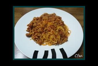 -200 gr de pasta-150 gr de carne picada-50 gr de jamón serrano en taquitos-1 diente de ajo-1 vaso de salsa de tomate (RECETA)-4 cucharadas de aceite de oliva-Sal-Pimienta negra