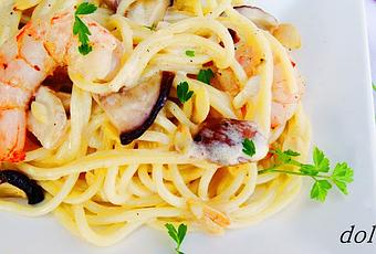 Ingredientes para 4 personas:350 gr. de espaguetis1 cebolla hermosa4-5 ceps (boletus edulis)20-25 gambas medianas peladas 250 cc de leche evaporada50-100 cc de leche2 c/s de almendras laminadasSal, pimienta negraPerejil Aceite de oliva virgen extraPoner a hervir la pasta siguiendo las instrucciones del fabricante. Escurrir, rociar con aceite y reservar.