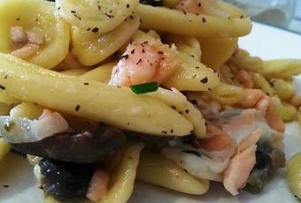 200 gr. de pasta Maritati, 3 lonchas de salmón ahumado, 2 rodajas de mozzarella, aceitunas verdes, tomillo, cebollino, cebolla, guindilla/picante, sal y aceite.