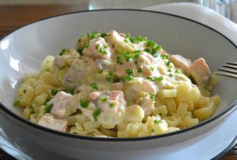 - Cuando esté lista, escurrir y añadir a la salsa que tenemos preparada junto con un par de cazos del agua de cocción. Mezclar, con el fuego encendido, durante unos segundos y servir. Disponer por encima un poco de cebollino picado.