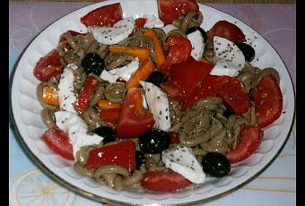 Una vez la pasta esté cocida la ponemos en el cuenco junto con la salsa, añadimos las verduras y las aceitunas. Revolvemos todo bien para que la salsa se integre bien y se mezcle con todos los ingredientes.