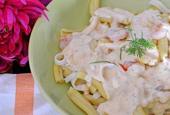 Cuando la pasta esté lista retiramos del fuego, escurrimos, añadimos las gamba cocidas y el surimi deshilachado y servimos con la salsita por encima. Riquísima!!