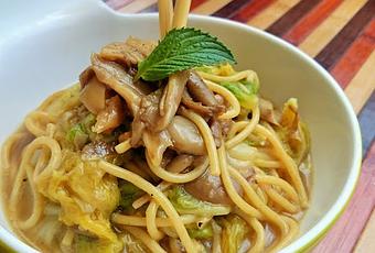♥250g de espaguetis♥1 hoja de laurel♥sal♥1 col china♥200g de champiñones ostra♥2 dientes de ajo♥2 cdas de salsa de soja♥1/2 cdta de zúcar integral♥1/2 cdta de maizena + 60ml de agua♥aceite vegetal♥pimienta♥sal