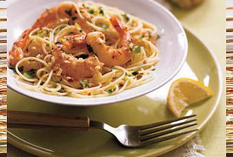 336 gr de fideos de cabello de ángel35 gr de manteca10 gr de harina355 ml de leche120 ml de crema espesa20 gr de pesto6 gr de perejil fresco, picado 3 dientes de ajo, picadas10 gr de queso Parmesano rallado10 gr de sal1 gr de pimienta blanca1 poco de salsa Worcestershire (para ver su preparación, ver la receta de mini emparedados de albóndigas)1 poco de salsa picante227 gr de brócoli455 camarones jumbo, pelados y limpios3 cabezas de ajo, picadas