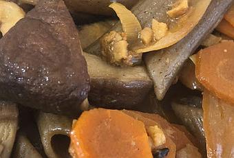 1 zanahoria1/2 puerro1 ajo1 cebolla pequeña1 pimiento verde3 setas hiitake (se pueden sustituir por champiñones)1/2 pechuga de pollo1 nuez de jengibre fresco1 trozo de cúrcuma fresca (opcional)2 cucharadas de curri4 cucharadas de Salsa de sojaAceite