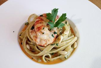 Luego la pasta enrollada, encima dos gambones, los piñones tostados y una hoja de perejil de decoración, un poco de aceite en crudo y a disfrutar.