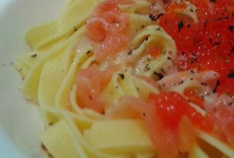 Esta vez le he puesto un poco de menta seca y eneldo Se emplata la pasta cocida, se salsea y se decora con tiras de salmón, que habremos reservado y cortado en tiras, y con las huevos de salmon.