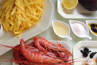 Mientras se cuecen, cortamos los gambones en trozos y una vez cocida la pasta la escurrimos y la rehogamos un par de minutos en el aceite de las gambas removiendo para que se impregne bien. Servimos la pasta en los platos, colocamos un par de gambones troceados sobre cada ración, agregamos un diente de ajo en trocitos sobre los gambones y rematamos con una cucharada de la crema de aguacate.
