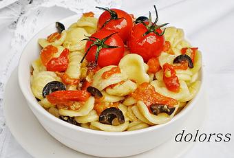 Ingredientes para 4 personas:300 gr. de pasta orecchiette2 pimientos rojos carnosos asados (aquí) 15-20 aceitunas negras deshuesadas1 diente de ajo12 tomates cherry Sal, pimientaAceite de oliva virgen extraHervir la pasta siguiendo las indicaciones del fabricante, en un par de minutos está hecha. Escurrir.