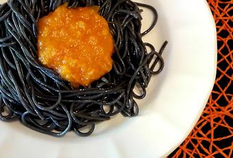 Preparamos también el tomate, bien lavado y troceado.Incorporamos ambos a la cebolla y cocinamos 30 minutos a 100ºC, velocidad 2. Sin Thermomix, dejamos hacer a fuego medio, removiendo de vez en cuando, hasta que la calabaza se ponga tierna. Es este caso mientras más pequeña se trocee mejor.Mientras, hervimos unos espaguetti siguiendo las indicaciones de preparación. Nosotros hemos elegido pasta "al nero di sepia". Me encanta el sabor, y el color le iba fenomenal a mi plan...Aderezamos la salsa con sal, pimienta y nuez moscada, y esperamos a que baje un poco la temperatura para triturar. Yo he programado 1 minuto a velocidad 6, pero eso también depende de la textura que queráis que tenga vuestra salsaTrituramos cuando haya bajado un poco la temperatura, y ya está lista para servir.Presentamos con la pasta en el centro de cada plato y vertemos la salsa por encima.Puedes ver también esta PASTA CON LANGOSTINOS Y MEJILLONES que hice para el RETO COCINILLAS con tallarines negros, porque coincidía también con Halloween.Os animo a hacerla ya que está buenísima.Y una cosita que en casa nos encanta con la pasta: unas escamas de sal Maldon al sevirla... No os imagináis el puntito tan bueno que le da...Os animo a preprar esta salsa. En casa ha encantado, así que he hecho bien en preparar en cantidad para congelar...Os dejo la receta para imprimir.¡Besitos!Con esta receta participo en el reto mensual de facilísimo.
