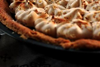 - Una vez que la tarta está lista , la dejamos templar antes de decorar con el merengue italiano. Rellena una manga pastelera con la boquilla que quieras y decora como más te guste . Espolvorea con las nueces picadas . Coloca la tarta en el grill del horno o con calor sólo por arriba 15 minutos .