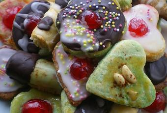 Fideos de colores, canela, guindas confitadas, etc, etc.