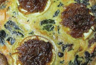 Sobre cada rodaja de queso, le ponemos unos montoncitos de cebolla caramelizada.