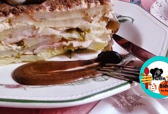 4.- Añadimos una capa de patatas sobre las anchoas, lo cubrimos con la mezcla de margarina, sobre esta ponemos una capa de jamón cocido. Así sucesivamente hasta llegar al borde de la fuente. Batimos el huevo con la nata y lo vertemos sobre el pastel. Cocinamos en el microondas 10 minutos a media temperatura, hasta que las patatas de se queden tiernas y cremosas.