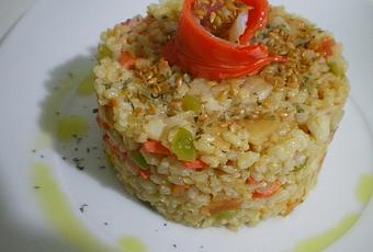 Delicioso pastel de arroz integral con un sofrito de verduras y como toque final unos taquitos de salmón y bacalao ahumados.Receta con sabores nórdicos, muy ligera y deliciosa a la par de sana.