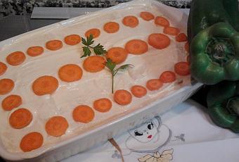 Un vez cubierto, cubrimos todo con mayonesa, rellenado todos los posibles huequitos. Adornamos (yo lo he hecho con rodajas de zanahoria) y al frigo. Servir frio.