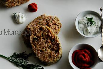 Carne picada de corderoBulgur (en este caso integral)Eneldo fresco, perejil y cilantroUn cebollaLa yema de un huevoSal, pimienta, cúrcuma, comino, ajoSalsa de yogur al eneldoSalsa harisaEmpezaremos poniendo el bulgur a remojo con agua caliente durante unos minutos. Utilizaremos la misma cantidad de bulgur que de carne picada. Picamos a cuchillo el ajo, la cebolla, el eneldo, el perejil y el cilantro. Mezclamos una vez el bulgur haya absorbido el agua, con la carne. Añadimos entonces las hiervas picadas, la sal y las especias a partes iguales. Añadimos el huevo. Mezclamos bien toda la masa.Con una gasa (podemos usar film plástico si no queremos aprovechar los jugos) hacemos una bola, prensamos con cierta ligereza a fin de amalgamar la carne y el grano. Prensamos bien y enrollamos, haciéndola rodar sobre alguna superficie y atamos los extremos. En abundante agua hirviendo introducimos el atado y dejamos cocer durante 30/40 minutos, dependiendo del tamaño. Dejamos enfriar.Una vez frío quitamos la gasa y cortamos como un fiambre. El agua de la ebullición, normalmente se reserva para elaborar cous-cous u otros guisos.Lo acompañamos con salsa de yogur al eneldo y harisa. Se consume frío.