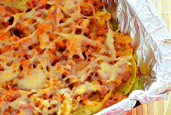 Ingredientes (2p): 2 calabacínes, 1 cebolla, 2 pimientos verdes, 300gr carne picada de ternera, 2 tomate triturado, harina, aceite de oliva, sal, pimienta y queso rallado.
