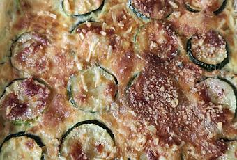 Rallar 1 de los calabacines escurrirlo e incorporar todos los demás ingredientes, menos el queso en lonchas. Mezclar bien