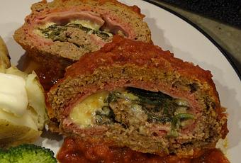 Coloque una hoja grande de papel de aluminio en el banco.En un tazón grande, combine la carne picada, el ajo, el perejil, los huevos, el pan rallado, sal y pimienta. Mezclar con las manos hasta que estén bien mezclados.Tip de carne picada en una lámina y forma en un rectángulo grande, aproximadamente 1,5 cm de espesor.Difundir el jamón, queso y espinacas sobre el rectángulo, dejando 2 cm alrededor del borde sin relleno.Tomando el borde largo de la hoja, fuertemente rodar el pastel de carne lejos de ti, metiendo en el queso y espinacas a medida que avanza. Tire hacia atrás de la lámina mientras rueda. Sellar los extremos de la carne picada así que el relleno no se escape.Envolver el pan entero en papel de aluminio y refrigere hasta que sea necesario.