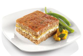 Combinar todos los ingredientes de la carne.Acomodar la mitad de la carne en un molde refractario, agregar el Queso Crema y el Queso tipo Americano, cubrir con la otra mitad de la carne. Tapar con papel aluminio y hornear a 180°C por 45 minutos, y ya esta listo para servir