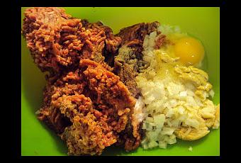 Remojar el pan en agua durante unos minutos hasta que estén blandos y exprimir el agua. Mezclar el pan con cebolla, carne, huevo, mostaza, sal y pimienta (al gusto).