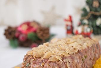 - En un molde de silicona o apto para microondas, cubrir la base con almendra laminada y colocar encima la mezcla de carne y frutos secos.