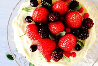 Partir por la mitad el bizcocho, mojar las partes internas con almíbar, sobre una mitad del bizcocho repartir un poco de la crema de mascarpone, poner fresas troceadas, colocar la otra parte del bizcocho pintar con el almíbar, terminar de poner la crema de mascarpone , los frutos rojos y las fresas, decorar con las hojitas de menta.