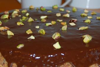Desmoldamos nuestro pastel y ponemos por encima el ganache y los pistachos que teníamos reservados.