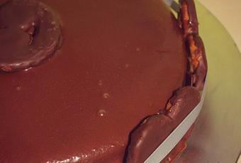 Cubrimos el bizcocho de coco con la cobertura de chocolate, dejándolo caer por los bordes.