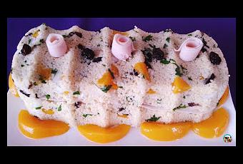 3.- Rellenamos un molde hasta la mitad, en el centro ponemos las varias lonchas de jamón de pavo. Cortamos unas en laminas de 1 centrimetro de ancho, las enrollamos y hacemos unas rosas para decorar. Volvemos a llenar el molde con el resto del cuscús. Presionamos con una cuchara, para prensar el pastel. Vertemos sobre un plato o bandeja. Decoramos con las rosas de jamón de pavo,unas pasa y los gajos de melocotones. Servimos enseguida o guardamos en la nevera una 1 hora, para disfrutar de un fresco plato.