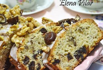 - Por último, preparamos un glaseado mezclando con unas varillas el azúcar glas con la leche hasta que no queden grumitos. Vertemos sobre el pastel frío y decoramos con más nueces y dátiles picados.
