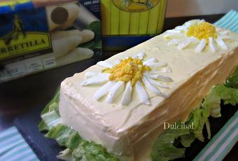 - 300 gr. de espárragos blancos escurridos CARRETILLA- 1 latita de atún en aceite- 4 huevos L- 400 ml. de leche evaporada- 2 rebanadas de pan de molde sin corteza- Sal- Pimienta negra recién molida* Decoración: - 2 huevos - 5 cucharadas de mayonesa - Unas hojas de lechugaPREPARACIÓN:- Escurrir muy bien los espárragos sobre un colador y aplastar con un tenedor para que suelten bien el caldo.- Escurrir también el atún.- Triturar todos los ingredientes del pastel con la batidora.- Verter en un molde tipo plum-cake y hornear, al baño maría (sobre una bandeja con un par de dedos de agua), a 190º durante unos 45 minutos o hasta que al pinchar en el centro la aguja salga limpia.- Dejar enfriar a temperatura ambiente.- Meter a la nevera hasta que esté bien fresquito (perfecto de un día para otro).- Desmoldar y decorar.- Untar todo el pastel con la mayonesa.- Cocer los dos huevos en agua hirviendo durante 10 minutos, pelar y enfriar. Cortar la clara en tiras y colocar en el pastel simulando los pétalos de una margarita, espolvorear yema en el centro.- Picar finita la lechuga y colocar alrededor del pastel.