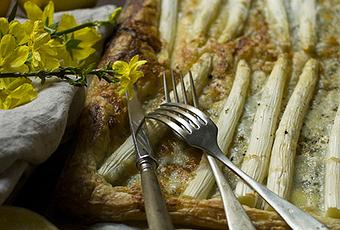 - Extendemos sobre la lámina de hojaldre la nata, encima el queso roquefort y colocamos los espárragos por encima. Salpimentamos, rociamos con un buen chorro de aceite de oliva y horneamos unos 20 min. o hasta que veamos que comienza a dorarse. Servimos.