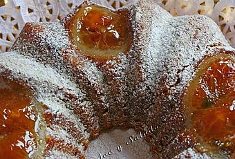 - Precalentar el horno a 170º. Engrasar y cubrir con papel vegetal el molde (si no fuera de silicona), y colocar unas rodajas de naranja y limón confitados en el fondo. Dejar a la espera.