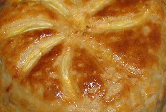 Una placa de hojaldre redonda1 queso Camembert200 gr. de bacon1 cebolla1 patata1 huevoMantequillaAceite de oliva