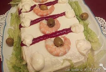 Cocemos los huevos en agua durante diez minutos. Picamos el salmón, la lechuga, los palitos de cangrejo, los langostinos (reservando unos pocos para la decoración), añadimos dos cucharadas de mayonesa y mezclamos. Forramos un molde con papel film abundante dejando que sobresalga por todos los lados, esto nos ayudará posterormente para desmoldarlo. Cubrimos la base del molde con pan de molde, cortando algunas rebanadas si fuese necesario. Untamos con mayonesa y repartimos la mezcla de langostinos y salmón. Colocamos otra capa de pan de molde y la pincelamos con tomate frito.Picamos los pepinillos, las aceitunas y los huevos cocidos. Añadimos el queso crema y mezclamos junto con una cucharada de tomate frito y de mayonesa. Extendemos por encima del pan de molde y tapamos con otra capa de pan. Cerramos el pastel con el papel film. Ponemos algún tipo de peso por encima del pastel para que haga presión - unos bricks de leche resultan perfectos - Dejamos en el frigorífico un mínimo de seis horas. Desmoldamos el pastel sobre la fuente de presentación y retiramos con cuidado el papel film. Cubrimos todo el pastel con mayonesa y decoramos con unos langostinos, aceitunas, tomate frito y unas hojas de lechuga en juliana alrededor del pastel.