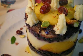 Montamos las tartitas con un aro de emplatar: para ello ponemos una capa de puré de patatas en el fondo, encima una de lombarda, otra de manzanas. Repetimos en el mismo orden hasta coronar el molde.