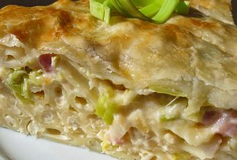 8- Echar en un molde desmontable y engrasado, primero la pasta, napar con el sofrito reservado y tapar con una lámina de hojaldre, someter los bordes , pintar con huevo y pinchar con un tenedor para que no suba el hojaldre.