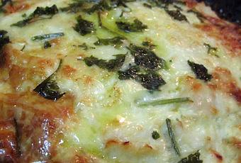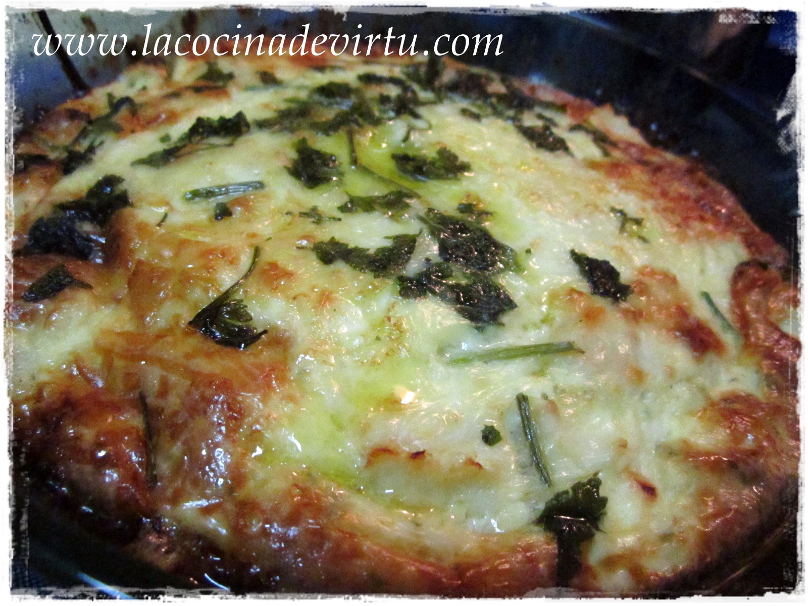 Desmenuzámos la merluza por encima. Espolvoreamos con queso rallado, rociamos con un chorrito de aceite y ponemos un poco de perejil picado por encima.