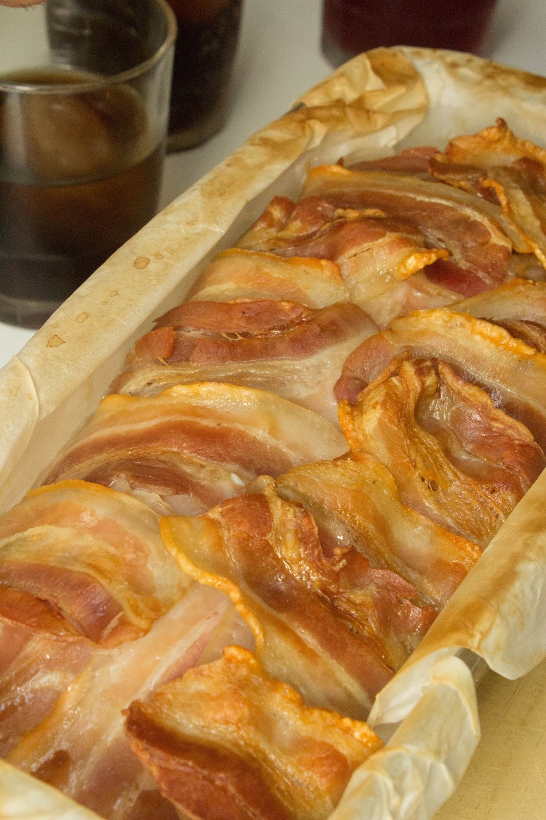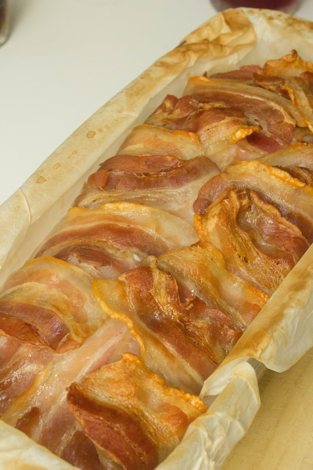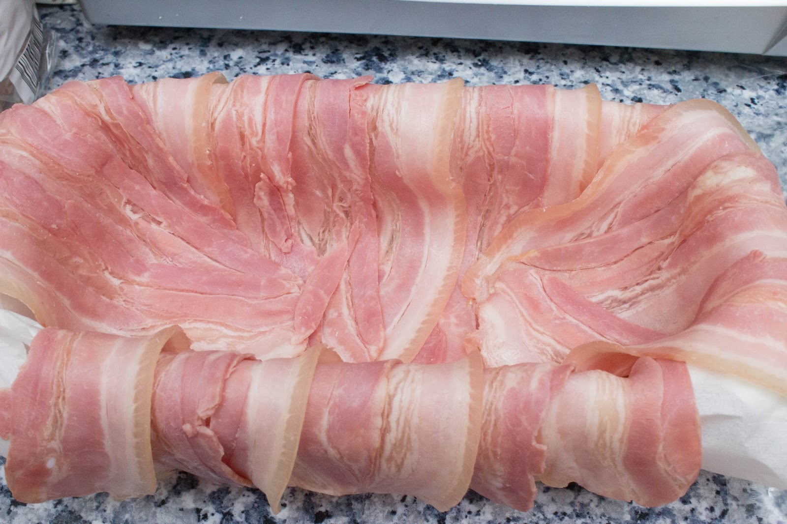 En un molde de cristal para horno poner un papel de horno dentro. Precalentar el horno a 220º Poner una capa de bacon haciendo dos tiras por desde la mitad para fuera, pegadas siempre. Luego poner otras 3 perpendiculares por los dos extremos. Como se puede ver en la foto queda todo el fondo cubierto de bacon y además cae por los 4 lados para luego poder tapar el pastel. Deja 3 lonchas reservadas para el final.