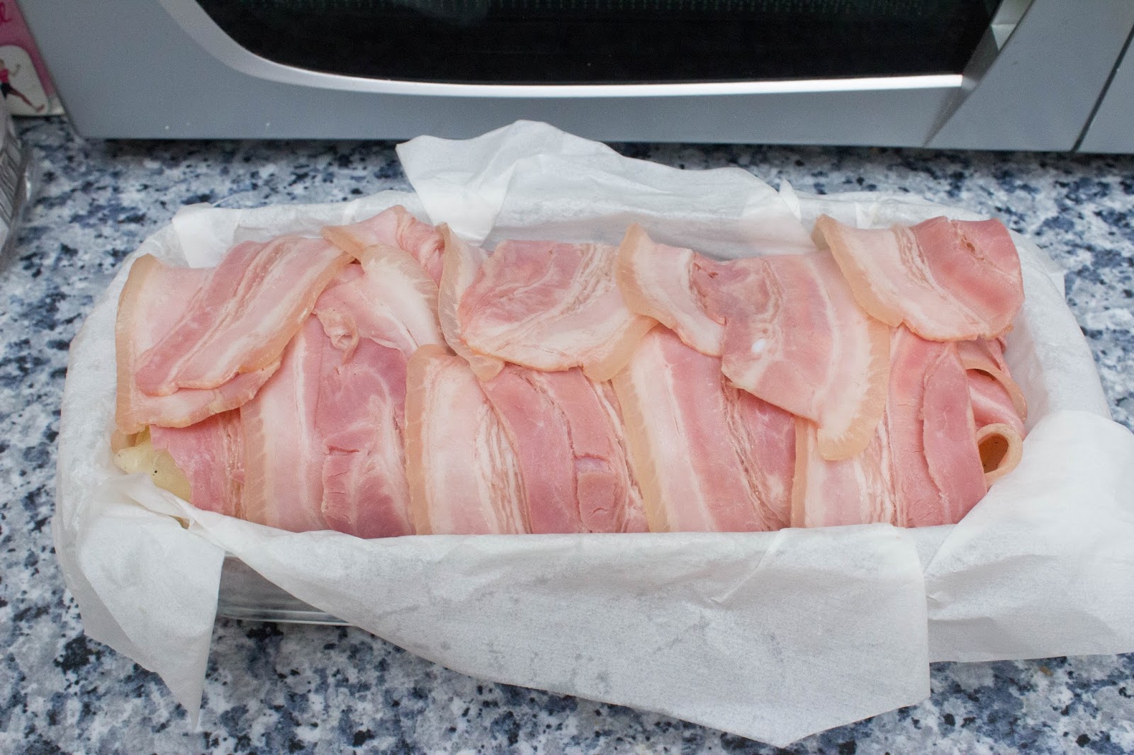 Con las 3 lonchas que reservamos ponerlas encima de la patata, que sería la última capa. Luego poner por encima el bacon que colgaba de los 4 bordes.