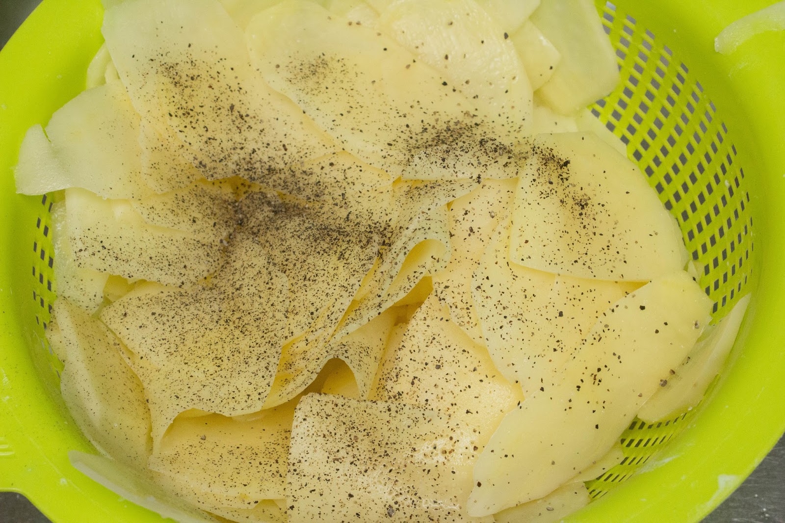 Cortar las patatas con una mandolina bien finitas. Luego echarlas sal y pimienta y dejarlas así 15 minutos.